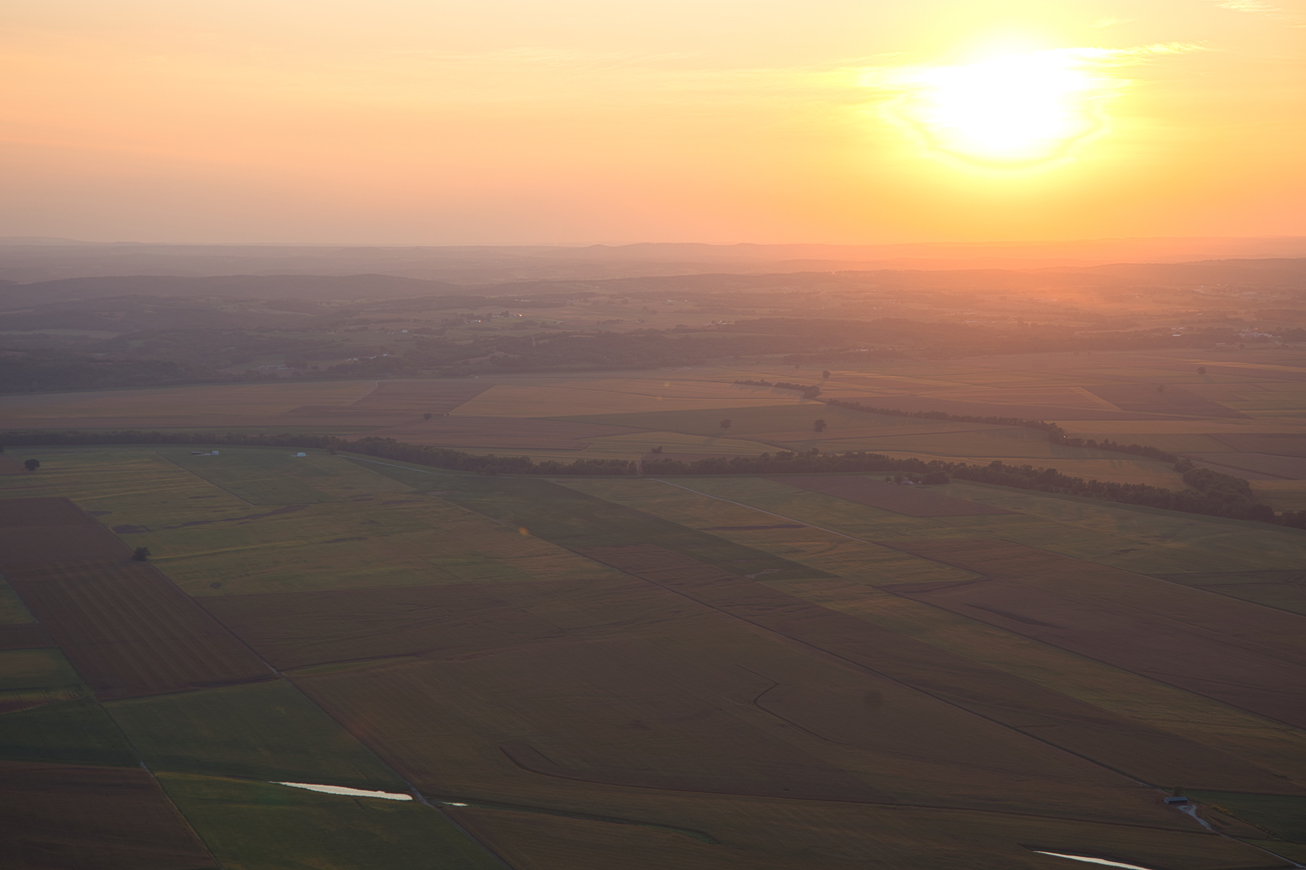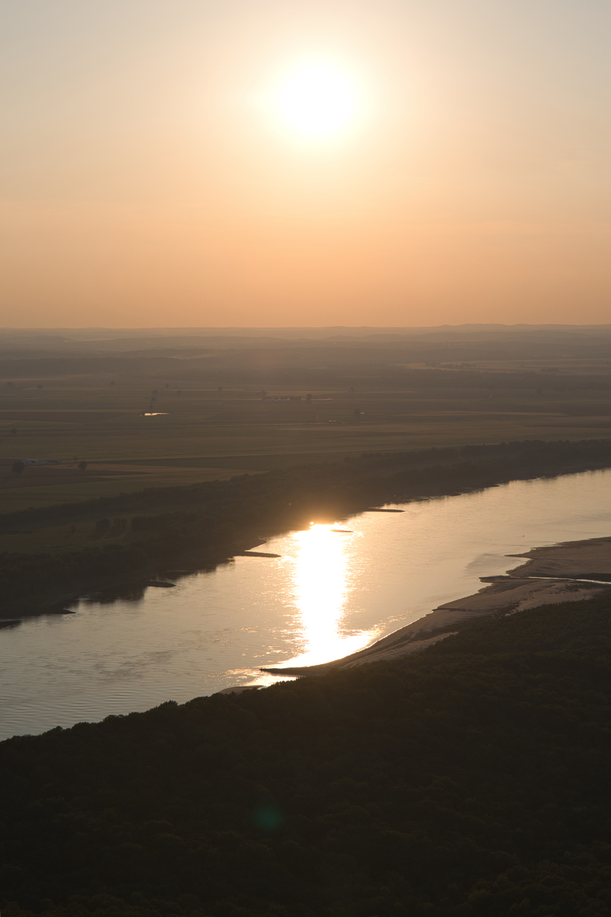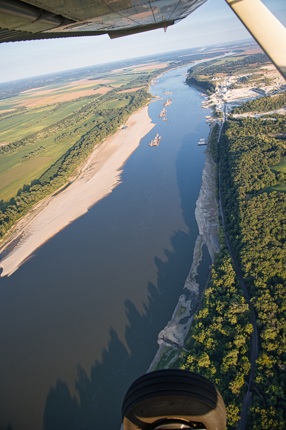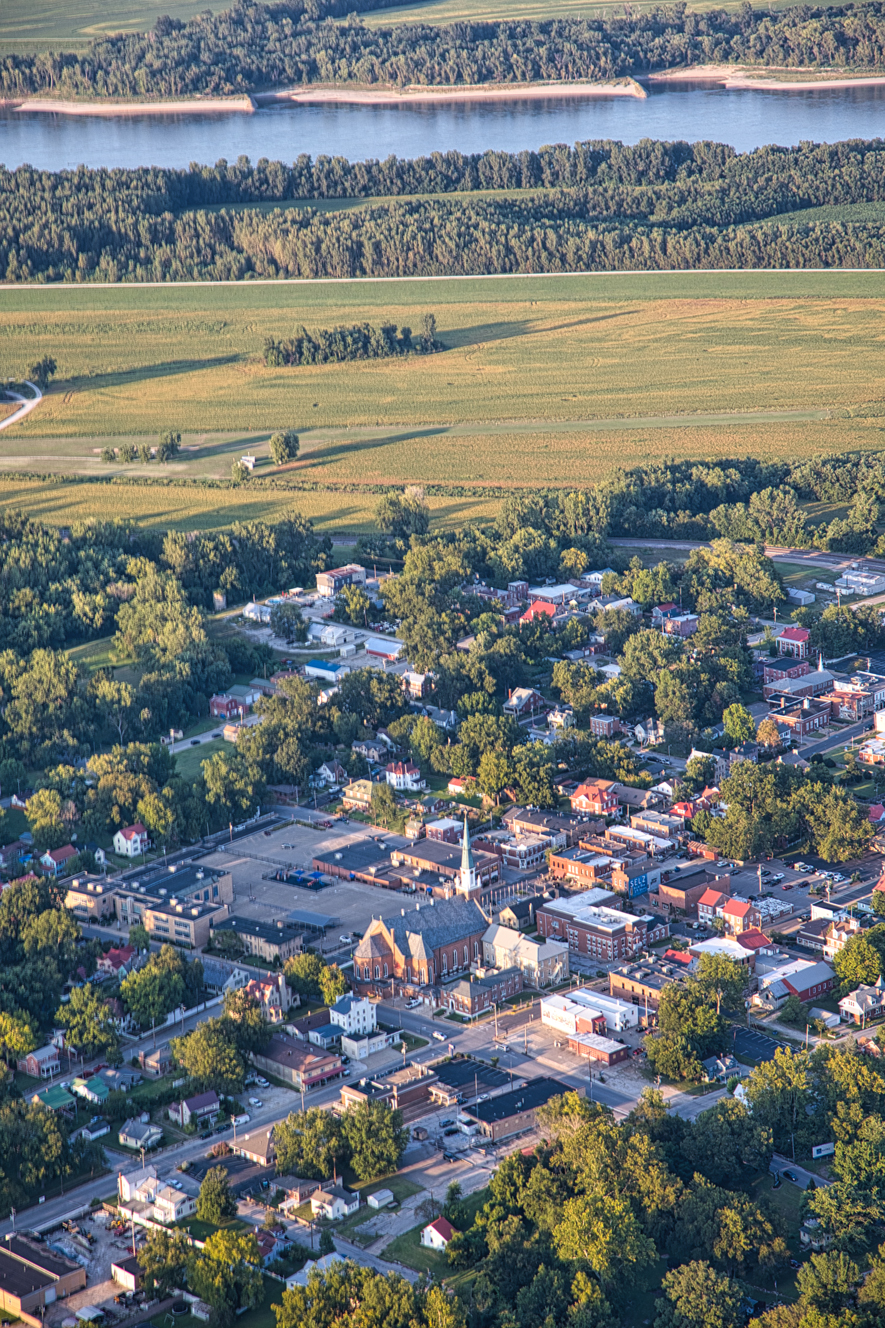 If you have never before seen Ste. Genevieve from the air, you are in for a treat. As you can see from these images, the shadows grew long and the vibrant landscape performed majestically. You’ll see about 30 photos in this clickable gallery, including rainbow hued farmland, city-scapes, the meandering Mississippi River (including bridges, a sand-dredging barge and the lock and dam).